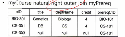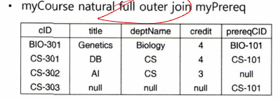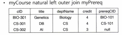 - Computes the join and then adds tuples in the other relation to the result of the join (uses null values) - 일차적으로 조인 연산을 수행하고, 조인 연산에서 제외된 튜플을 널 값을 이용하여 결과 테이블에 첨가함