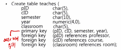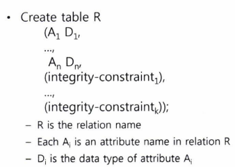 - R이라는 새로운 테이블을 정의하여 생성, 뒤에 속성명과 도메인 명이 쌍을 이루고, 관련 데이터 무결성 제약이 나와야 함
