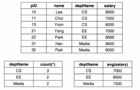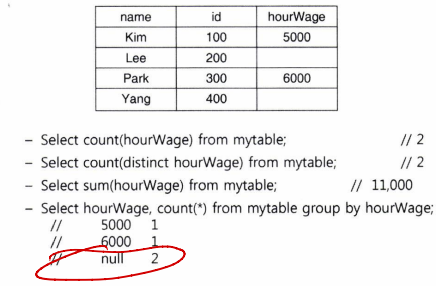 - All aggregate operations escept count(*) ignore tuples with null values on the aggregated attributes - count(*)을 제외한 집계함수들은 모두 null 값을 무시함