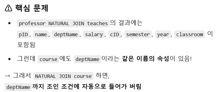 - professor.pID = teaches.pID and professor.deptName='CS'와 동일