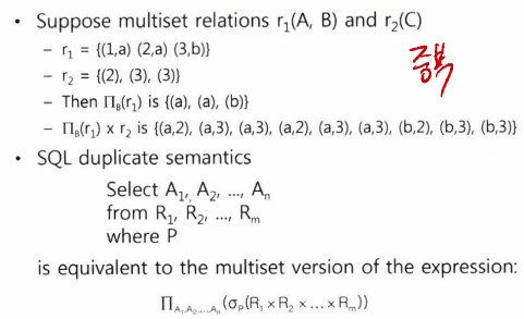 - SQL supports tuple duplicates in relations (i.e. muliset) - SQL 테이블은 동일 튜플의 중복을 허용하는 튜플의 멀티셋임