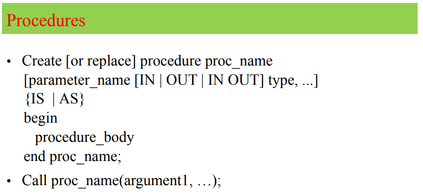 - SQL 표준은 SQL에 절차적인 확장을 지원하며 이를 SQL/PSM이라 하며 사용자는 이를 이용하여 데이터 베이스의 임의 연산을 수행하는 procedure(or function)를 개발할 수 있음