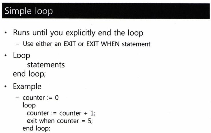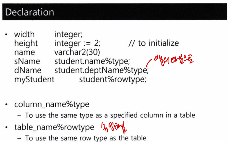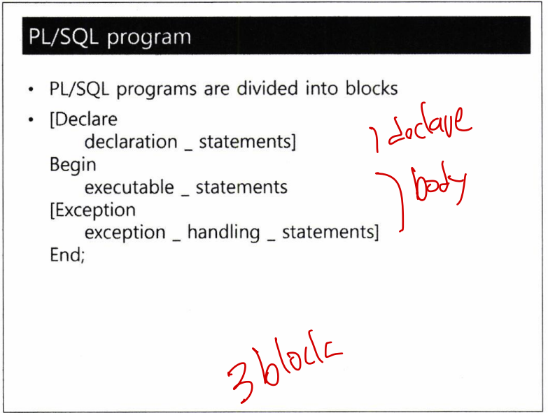 - 쿼리문은 Delcare, body, exception 3 block으로 이루어져 있음