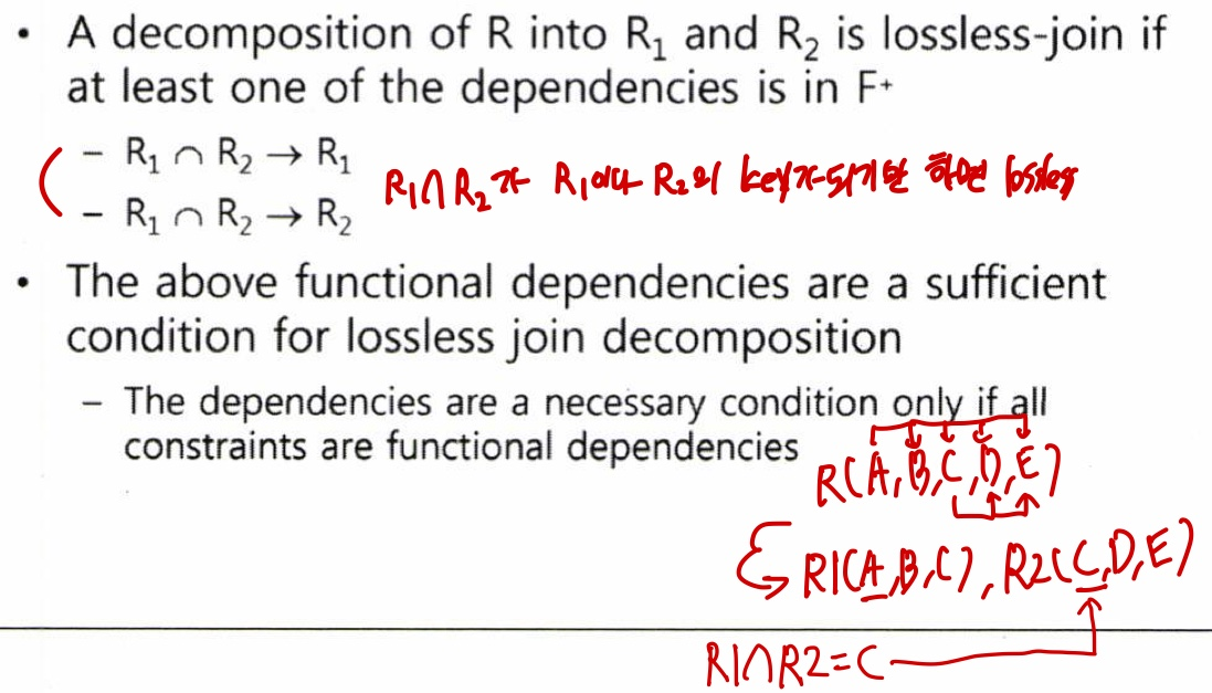 - 즉, 위 필기 예시에서 R 테이블을 R1, R2로 분해했을 때, "R1∩R2"가 R1 or R2의 주 키이면 무손실 조인 분해가 성립