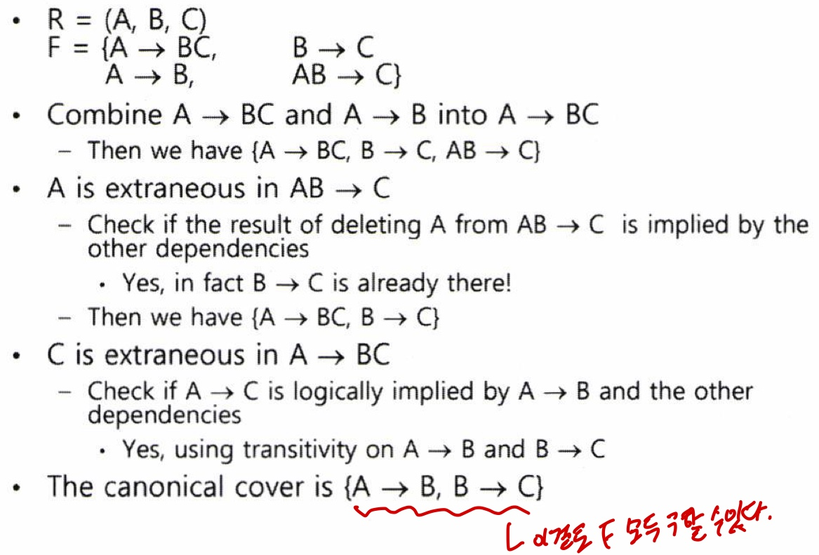 - 함수 종속성간에 중복성이 존재할 수 있음