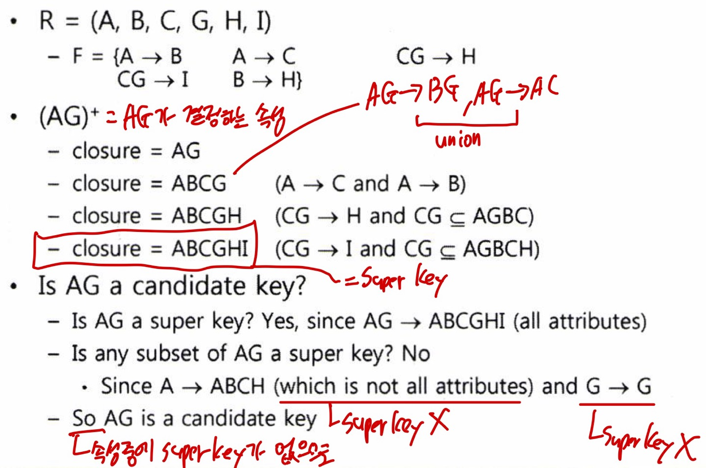 - A가 B를 포함하는 슈퍼집합일 때, A가 B를 함수적으로 결정하는 것은 어떤 테이블 인스턴스에 대하여도 항상 만족을 함
