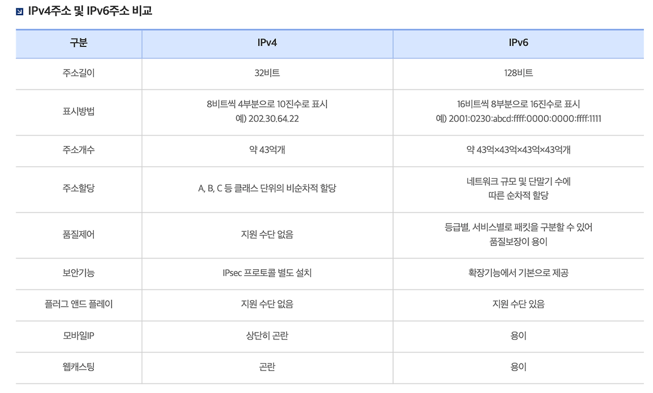 - 일반적으로 IPv4, IPv6와 같이 2가지의 방법을 사용, 현재 까지는 IPv4를 많이 사용