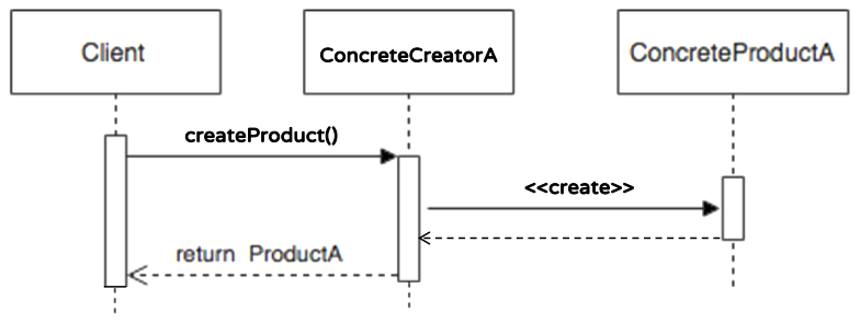 - Client는 ConcreteCreatorA를 통해서 Product 객체를 전달받음