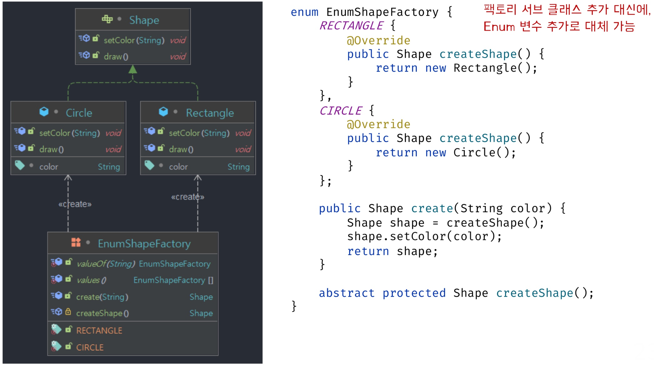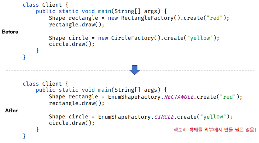 - Enum으로 팩토리 메서드 패턴을 구성해 준다면, 일일이 서브 팩토리 클래스 구현 없이 하나의 enum Factory에서 구성할 수 있음
