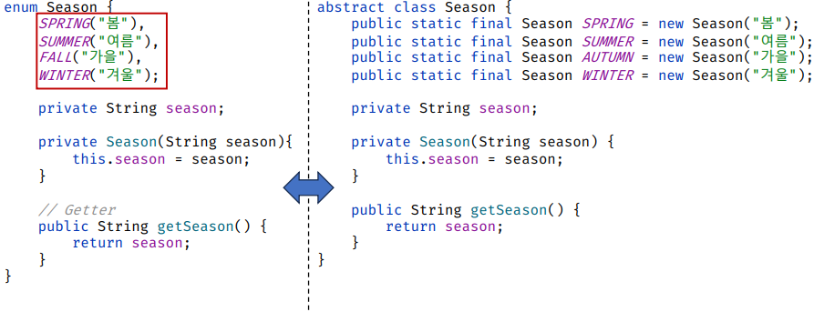 - 부가 기능: $values()$, $valueOf()$, $name()$ 사용 등 표준 유틸 제공