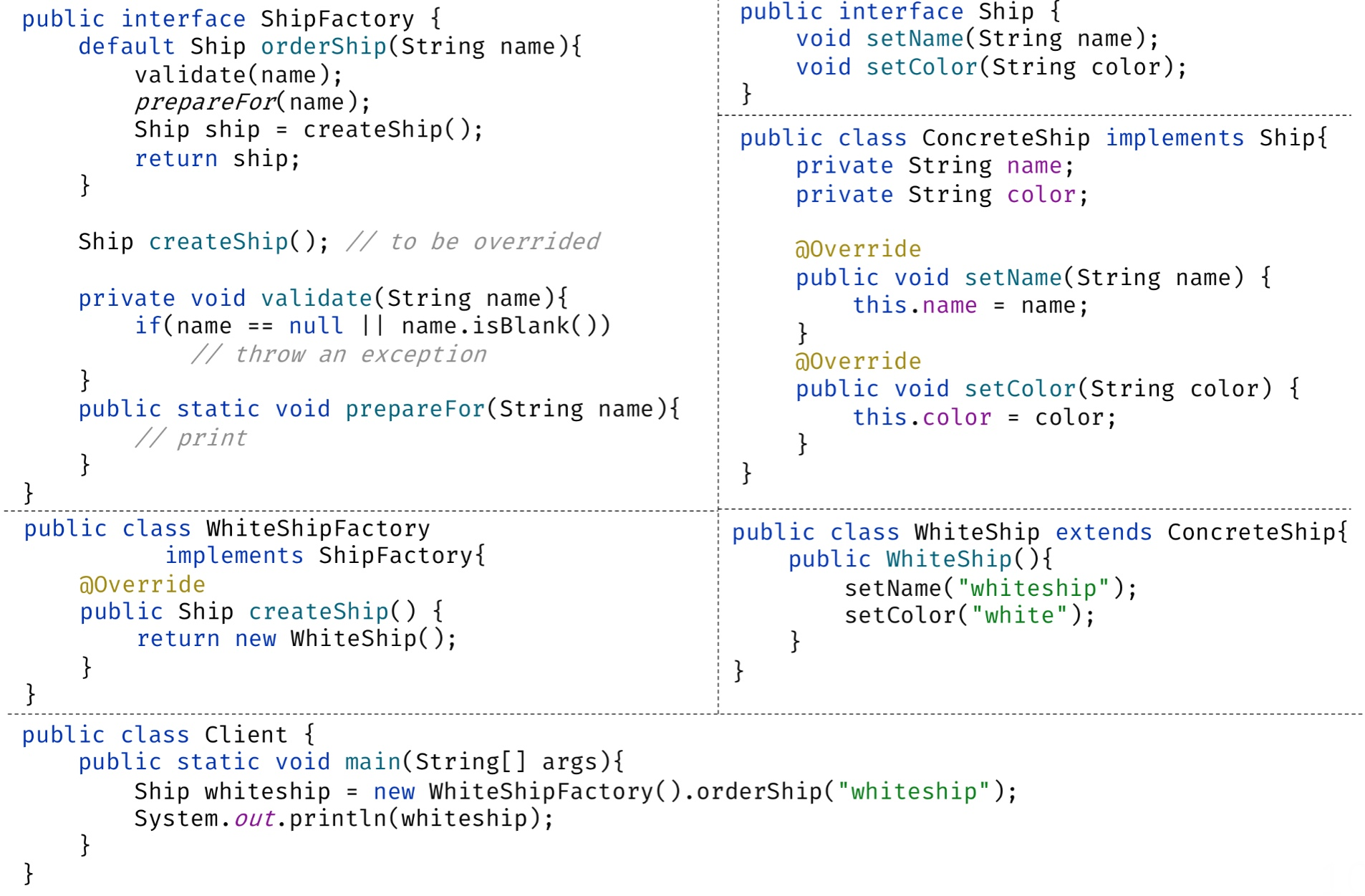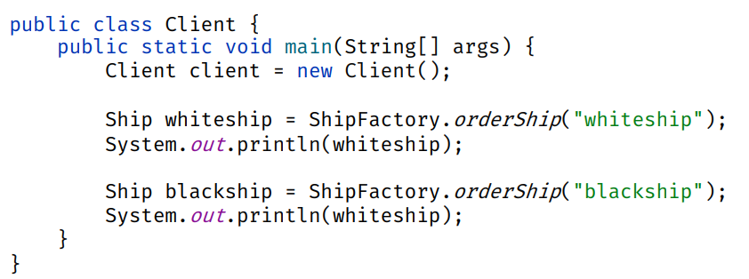 - Client의 main에서 new WhiteShipFactory().orderShip("whiteship") 호출