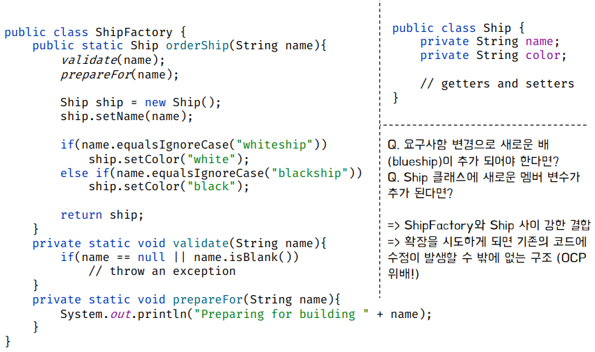 - Ship 클래스에 새로운 멤버 변수가 추가(필드가 늠)되면 ShipFactory 코드도 함께 수정되어 변경 파급이 큼