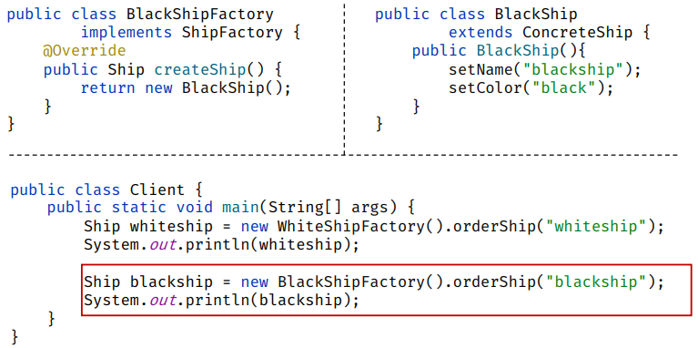 - ShipFactory가 구체 규칙(화이트/블랙 색, 어떤 Ship을 만들지)을 직접 알고 있어 Ship과 강하게 결합됨
