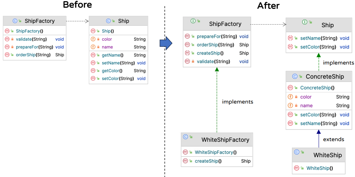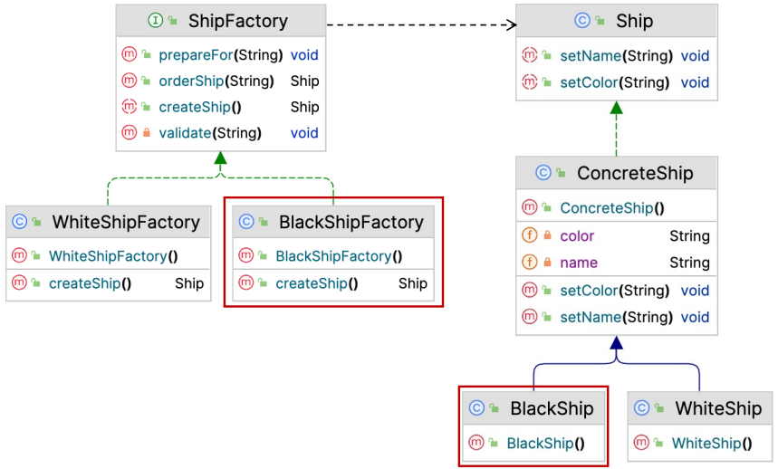 - ex) ↓ 배를 만드는 공장(ShipFactory)에서 client의 요청에 맞추어 배를 주문받아(orderShip) 배(Ship)의 객체를 주는 상황