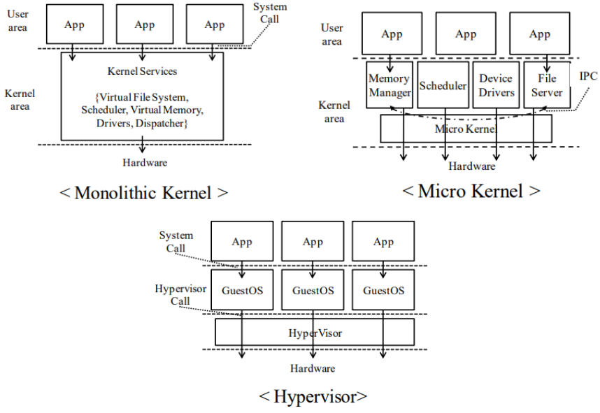 | 구분 | Monolithic Kernel | Micro Kernel | Hypervisor |