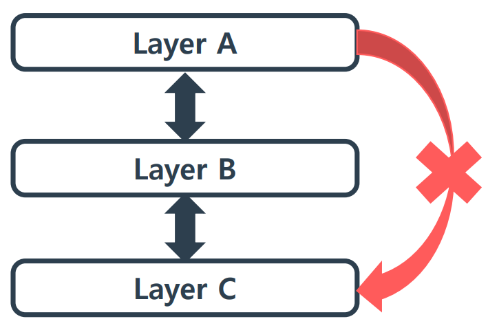- 하위 Layer 서비스만 사용: 상위 레이어는 하위 레이어가 제공하는 서비스를 인터페이스로만 의존해 사용