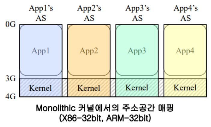 - 하나의 주소 공간: Kernel의 모든 Service가 같은 주소 공간(Address Space)에 위치
