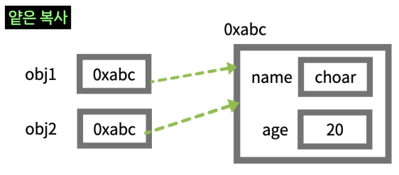 - Shallow copy(얕은 복사): 객체의 필드 값만 복사 (포인터 값 복사)