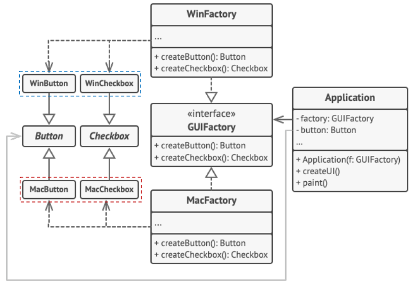 - 제품별로 인터페이스를 추상화하고, 모든 추상 제품에 대한 생성 메서드를 가지는 팩토리로 추상화합니다.