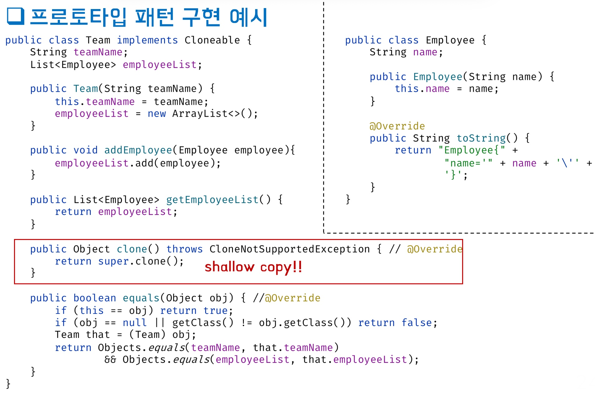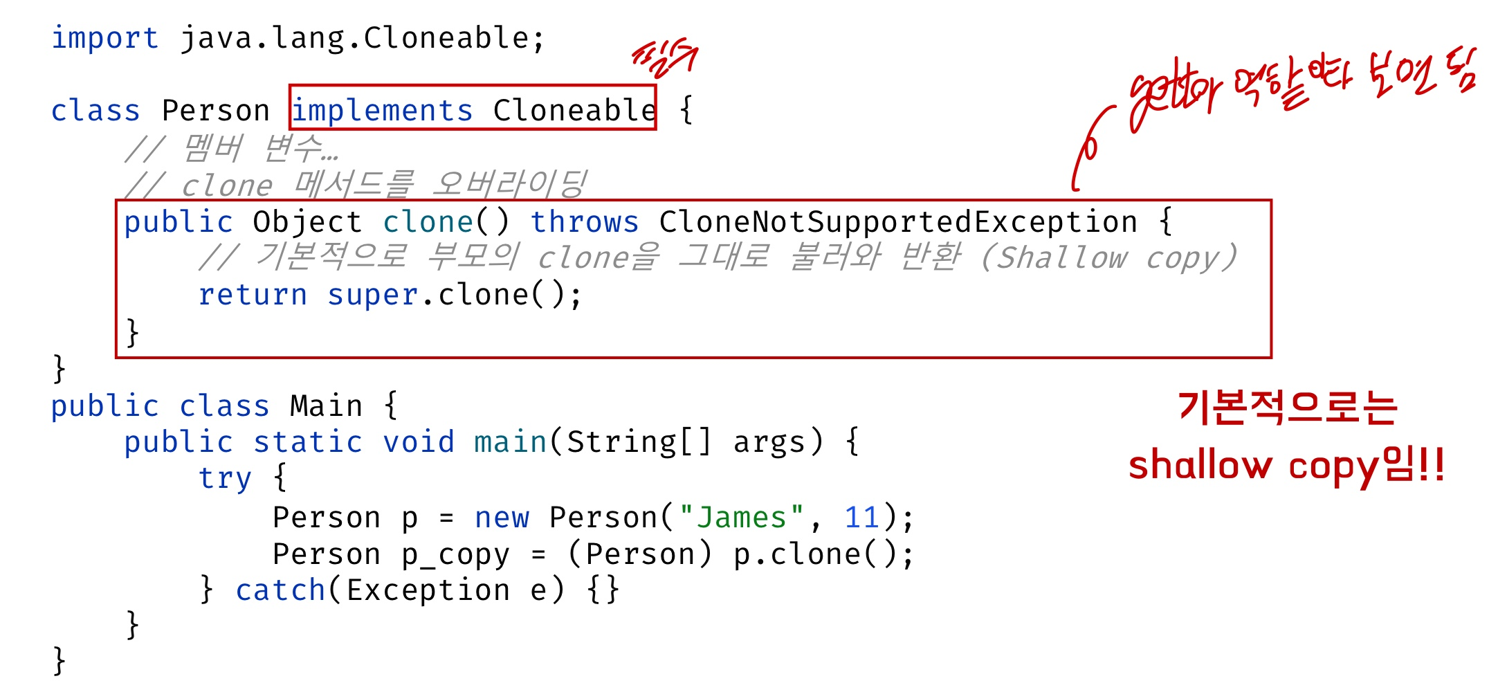- clone() 메소드를 사용하려면 Cloneable 인터페이스를 implements 하고 clone() 메소드를 오버라이딩 해주어야 함 (Prototype 인터페이스 역할)