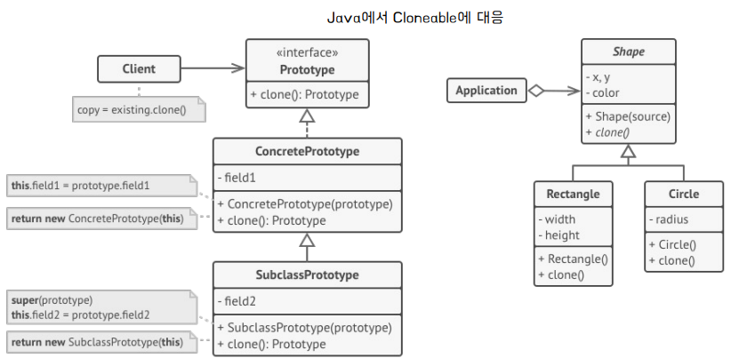 - 간단한 과정: 객체를 생성하는 복잡한 과정을 피할 수 있음 (생성자 호출 대신 복제)