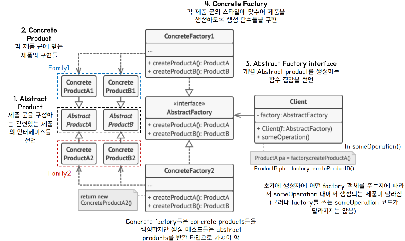 - 팩토리 메서드 패턴이 단일 객체 생성을 추상화하는 반면, 추상 팩토리 패턴은 관련 있는 여러 객체(제품)들의 일관된 생성을 추상화함