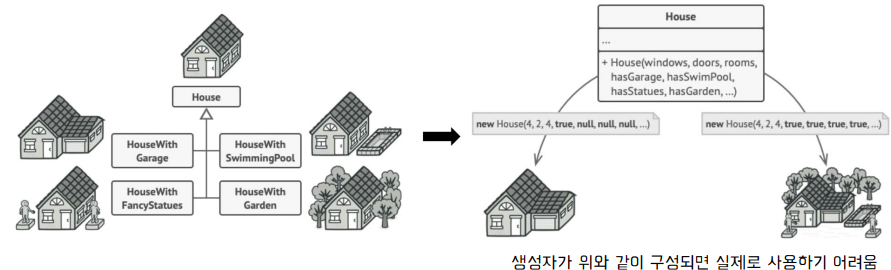 - 객체 생성 및 초기화 시 멤버 변수가 많을 경우, 모든 멤버 변수를 생성자에 넣는 것이 비효율적일 수 있음
