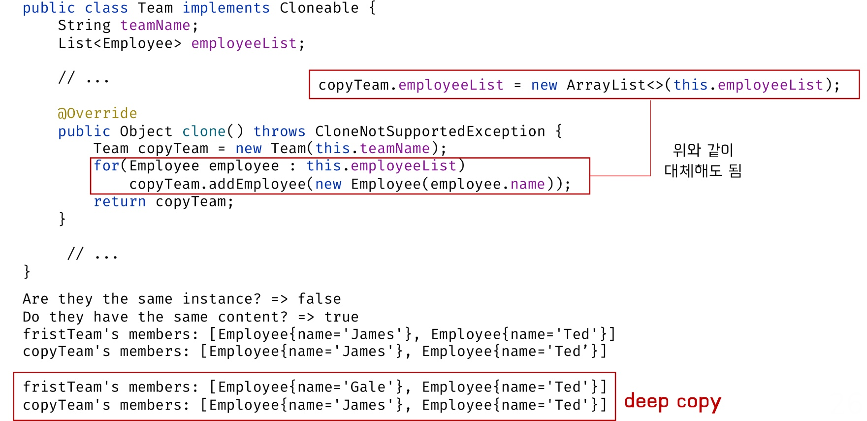 - 만약 deep clone이 되게 복사를 하고 싶으면 clone() 메소드에서 deep copy 될 수 있도록 변경해 주면 됨