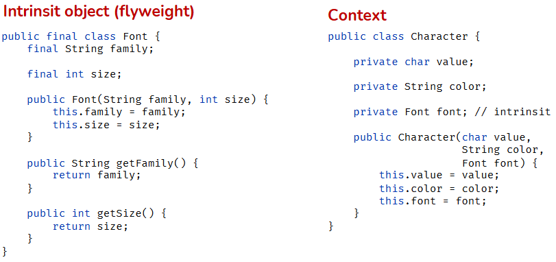 - Flyweight: 공유할 수 있는 부분이 포함됨(Intrinsic state: 변하지 않는 속성)