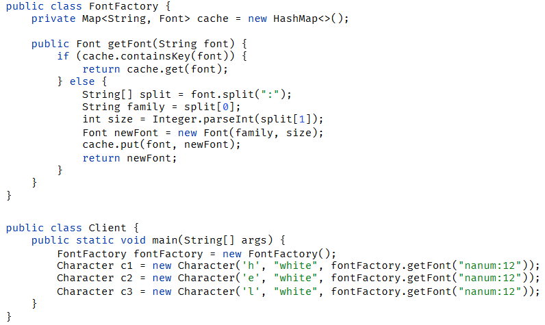 - FlyweightFactory: 캐시를 이용하여 Flyweight Pool을 관리하고, 요청된 객체가 이미 캐시에 있으면 그것을 반환