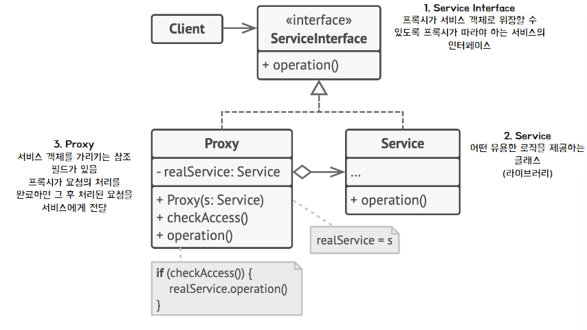 - ServiceInterface: 프록시와 서비스 객체가 따라야 하는 공통 인터페이스(Service의 환경과 동일하게 상속받게끔 함)
