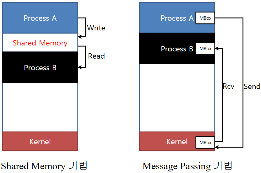 | Message Passing | Send and Receive | Kernel 경유 | Kernel에서 데이터 버퍼링 | 문맥 전환 연관 (Overhead 발생 가능) |