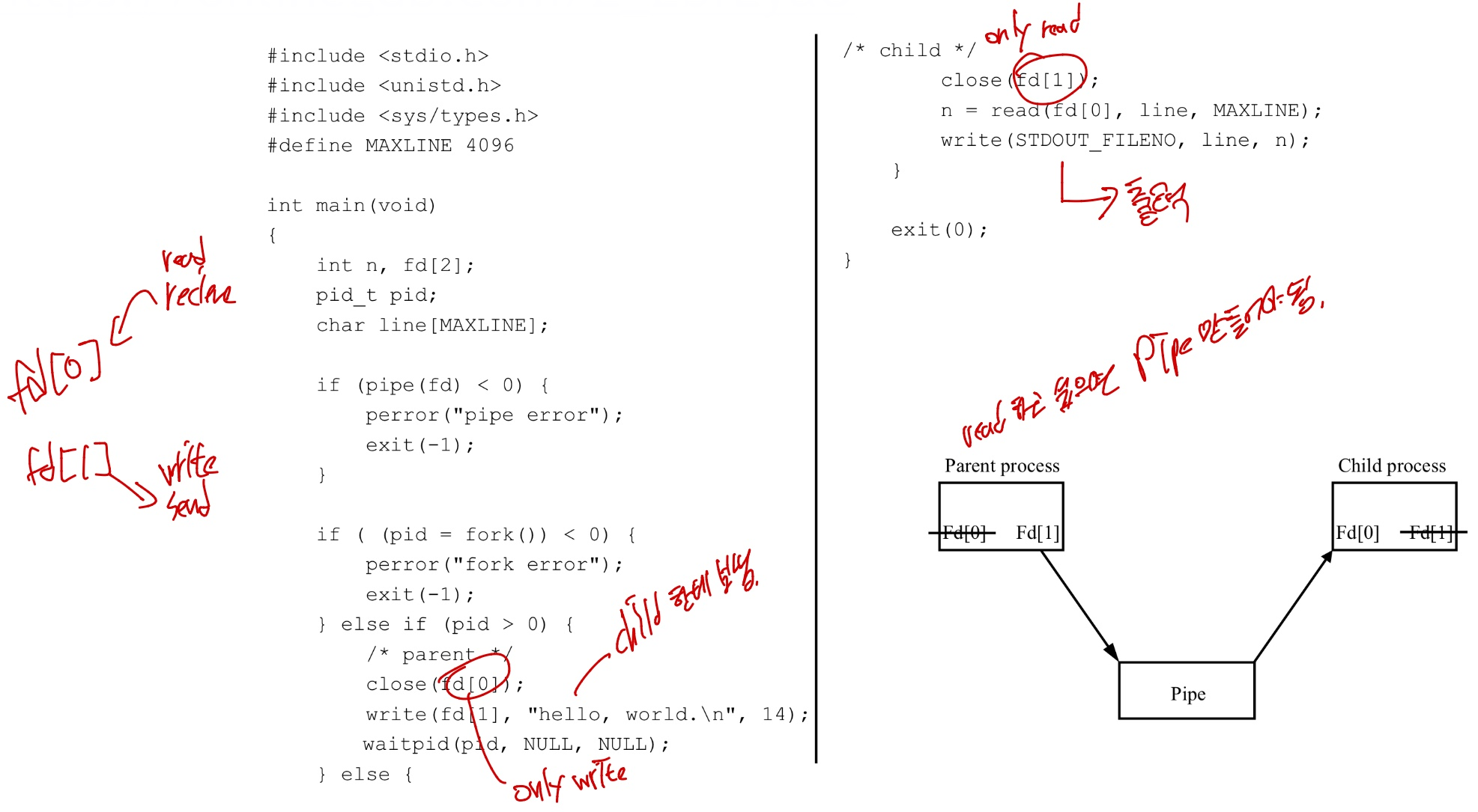 - 마찬가지로 자식은 close(fd[1])로 write(쓰기 끝)를 닫아 fd 누수를 막음