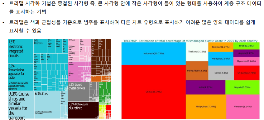 | 분포 시각화 (Distribution) | 데이터를 부분으로 분리하고 부분 간의 관계 표현. | 파이 차트, 도넛 차트, 누적 영역 그래프, 트리맵 |