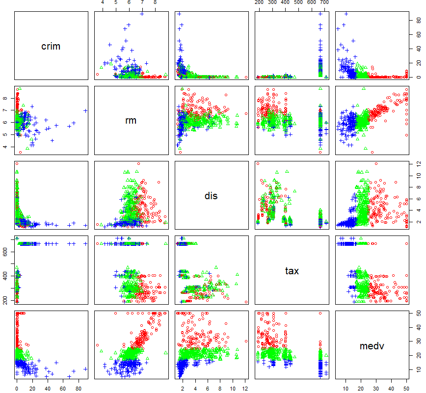 - medv(주택 가격)를 기준으로 보았을 때 상관계수가 가장 높은 것은 rm(가구당 방의 개수)으로 약 0.695
