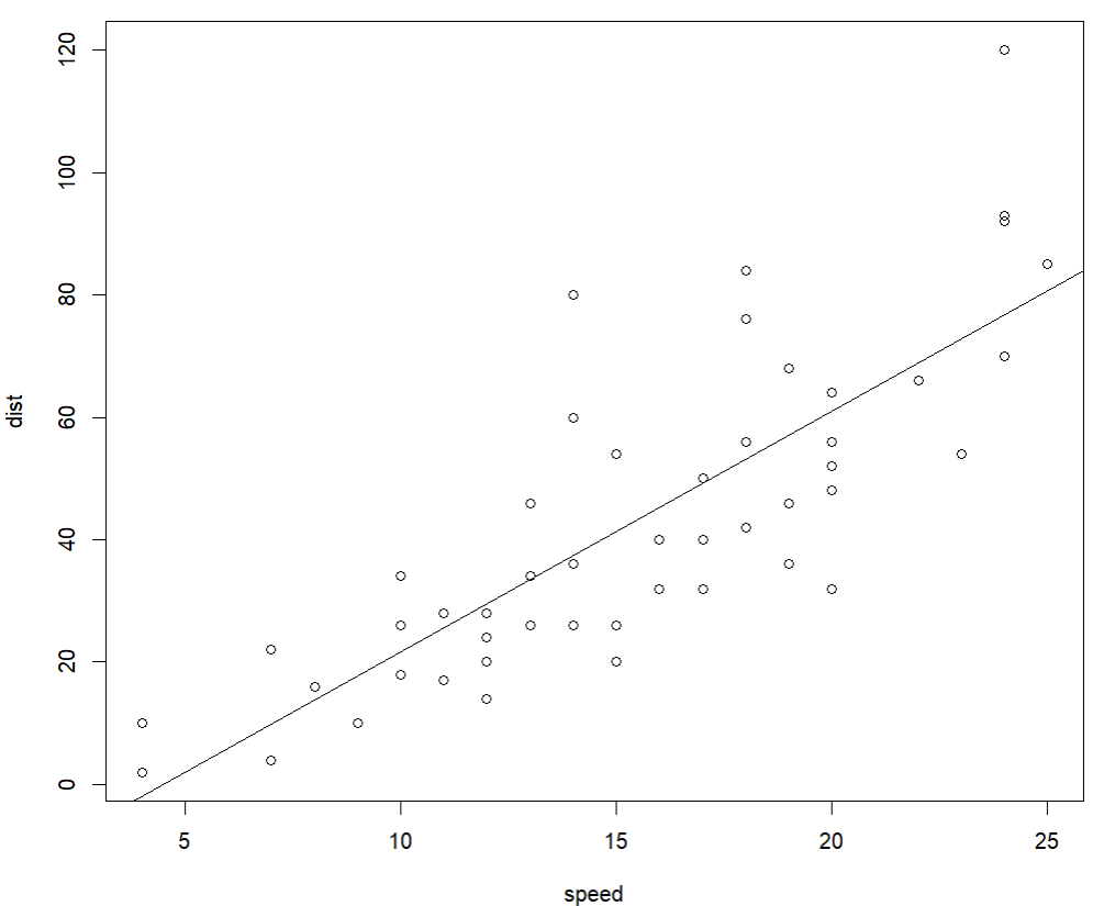 - 추정된 회귀식이 dist = -17.579 + 3.932 × speed라는 뜻