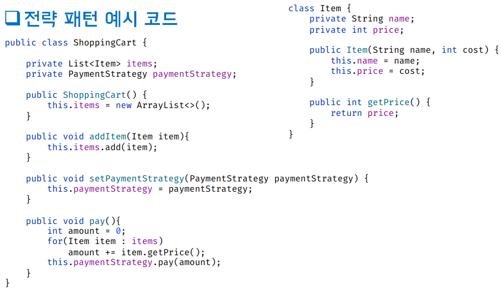 - 전략(Strategy): 일종의 알고리즘, 기능, 동작을 의미