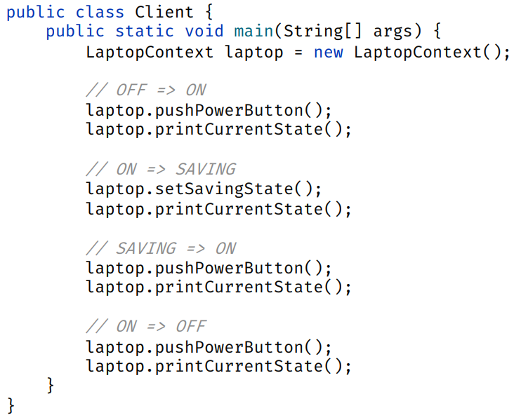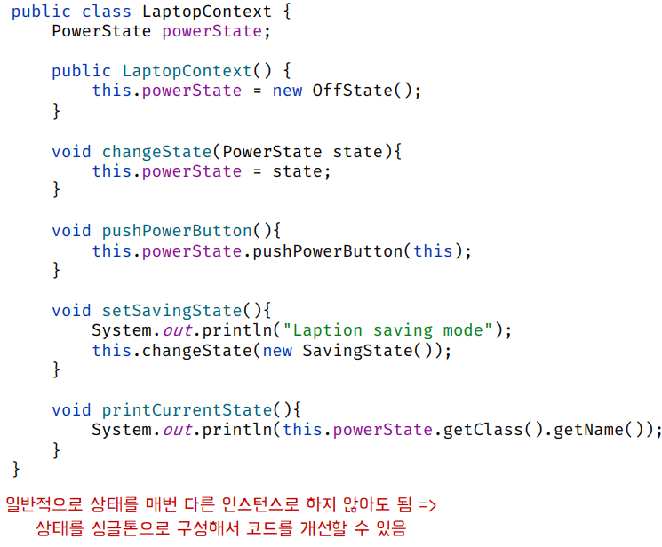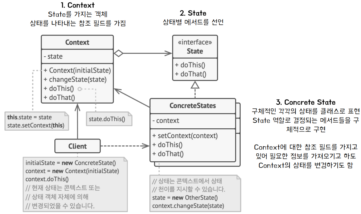 | 1. Context | State를 가지는 객체. 상태를 나타내는 참조 필드를 가지며, 외부에서 Context의 메서드를 호출하면 현재 상태 객체에 위임 |