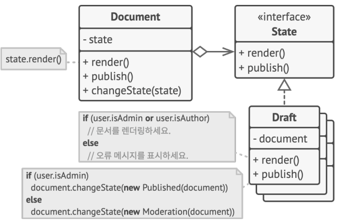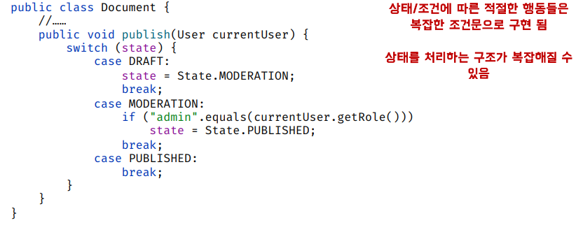 - 만약 문서(Document) 클래스가 Draft(초안), Moderation(검토), Published(출판됨)와 같은 여러 상태를 가지고 publish 메서드가 각 상태에 따라 다르게 작동해야 할 때
