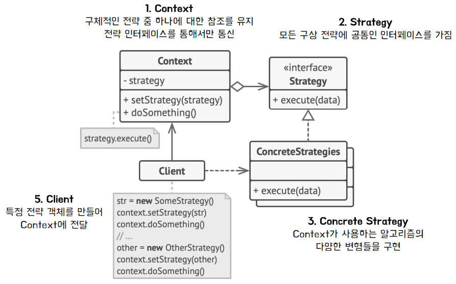 | Strategy (Interface/Abstract Class) | 모든 구상 전략에 공통인 인터페이스를 정의. |