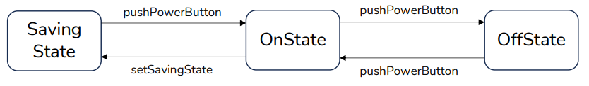 | 3. Concrete State | 구체적인 각각의 상태를 클래스로 표현. State 역할로 결정되는 메서드들을 구현하며, Context에 대한 참조를 가지고 있어 상태를 변경하거나 정보를 가져오기도함. |