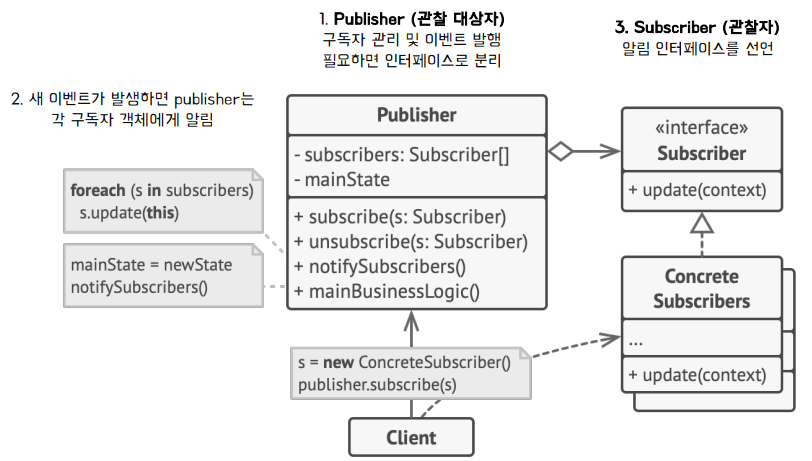 - 정의: 옵저버들이 관찰하고 있는 대상(Publisher/Subject)의 상태 변화가 있을 때마다 대상자는 각 관찰자(Observer/Subscriber)에게 통지하고, 관찰자들은 알림을 받아 조치를 취하는 행동 패턴(= 발행-구독 모델)