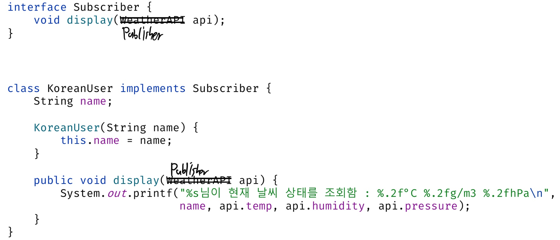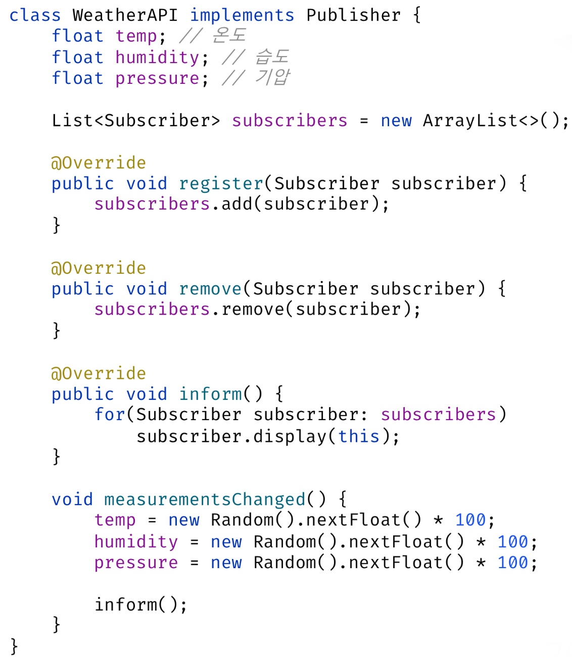 - 구조 다이어그램엔 없지만 Publisher가 Interface, WeatherAPI가 Concrete publisher라고 생각하면 됨