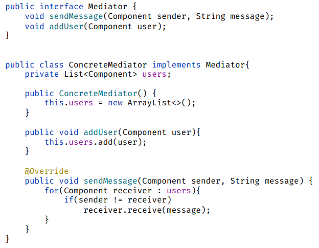 - 정의: 객체 간의 직접 통신을 제한하고 중재자 객체(mediator)를 통해서만 협력하도록 하는 행동 패턴