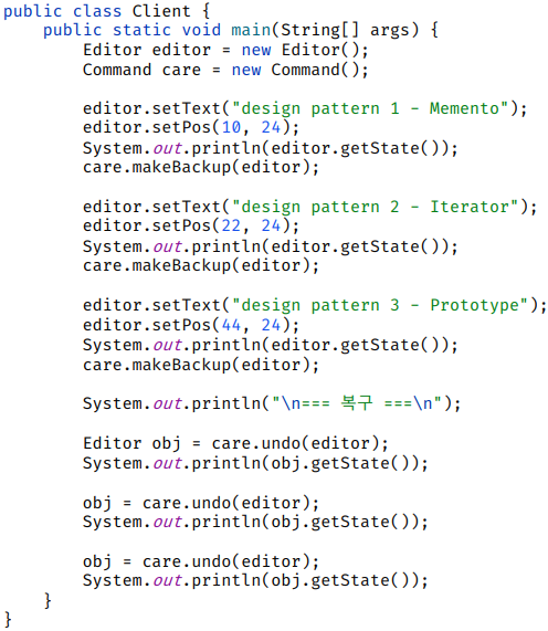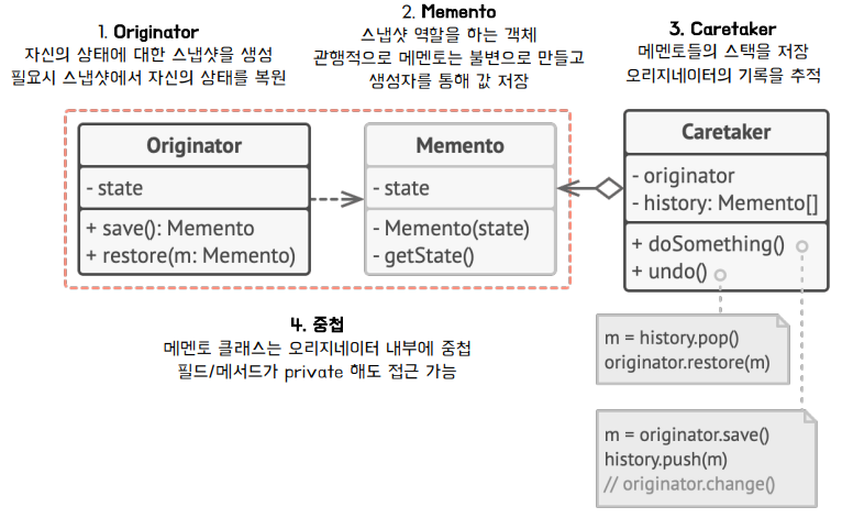 - 객체의 구현 세부 사항을 공개하지 않으면서 해당 객체의 이전 상태 값을 저장하고 복원할 수 있게 해주는 행동 패턴