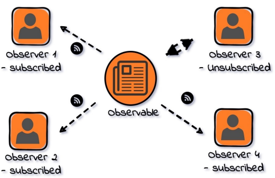 - 옵저버(Subscriber)들이 관찰하고 있는 대상(Publisher)의 상태 변화가 있을 때마다 대상자(Publisher)는 직접 각 관찰자(Subscriber)에게 통지하고 관찰자들은 알림을 받아 조치를 취하는 행동 패턴