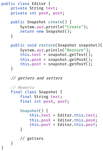 private static class Snapshot implements Memento { ... }