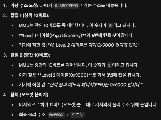 - 물리 주소 생성: 최종 PFN에 논리 주소의 오프셋을 결합하여 실제 물리 주소를 생성