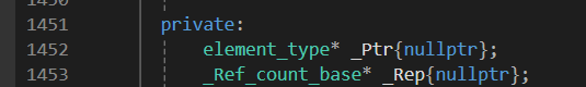 - 다음과 같이 shared_ptr은 element_type, _Ref_count_base를 멤버 변수로 가지며, _Ref_count_base는 _Uses, _Weaks 두 개의 멤버 변수를 가지고 있음
