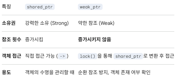 - weak_ptr은 shared_ptr과 유사하지만 가리키는 객체의 수명에 영향을 주지 않는 약한 참조를 하여 순환 참조를 피함